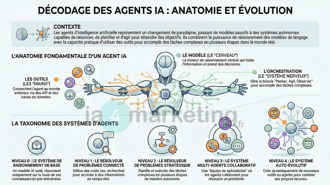 Analogie : implémenter un agent marketing, c’est comme recruter un nouveau membre de l’équipe. Vous ne vous contentez pas de lui donner des ordres (scripts) ; vous lui donnez une mission (objectif), des outils (API), un accès aux archives (données) et vous le coachez (AgentOps) pour qu’il devienne autonome et performant.